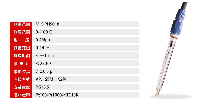 MIK-PH-5018在線高溫玻璃電極適用于測試溫度較高,有腐蝕性的介質。電極敏感區(qū)域大、抗機械沖擊強、響應快和穩(wěn)定性好。該電極能廣泛用于微生物技術、制藥、食品飲料、制糖,包括氯堿、采礦冶煉、造紙、紙漿、紡織品、石油化工、半導體電子工業(yè)等各種化工流程及廢水處理等領域。